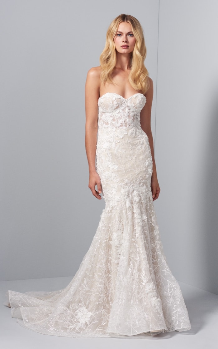 Strapless fit-to-flare bridal gown, done in an embellished and dimensional floral lace with illusion corset bodice, molded cups and chapel train.