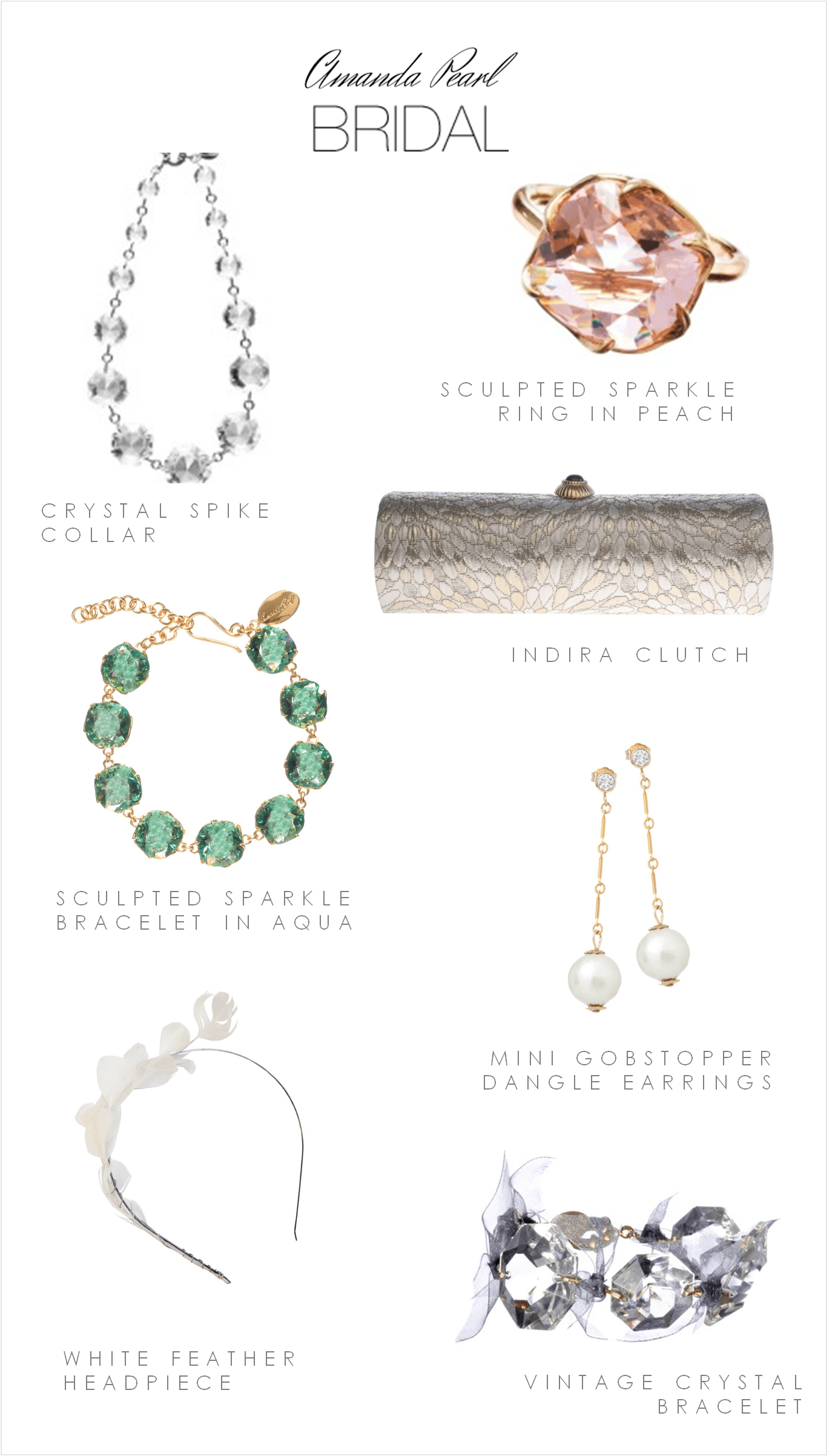 Clockwise from Top Left : Crystal Spike Collar / Sculpted Sparkle Ring in Peach / Indira Clutch / Mini-Gobstopper Dangle Earrings in Gold / Vintage Crystal Bracelet in Platinum Organza / White Feather Headpiece / Sculpted Sparkle Bracelet in Aqua