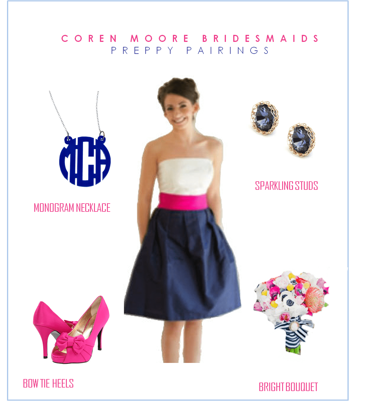 To top off this post, I've made one set with one of the truly one of a kind looks. I love this white, navy, and pink Courtney dress, and I wanted to pair it a monogram necklace, some bright pink heels, and a bright happy bouquet for a really bold, bright preppy look.