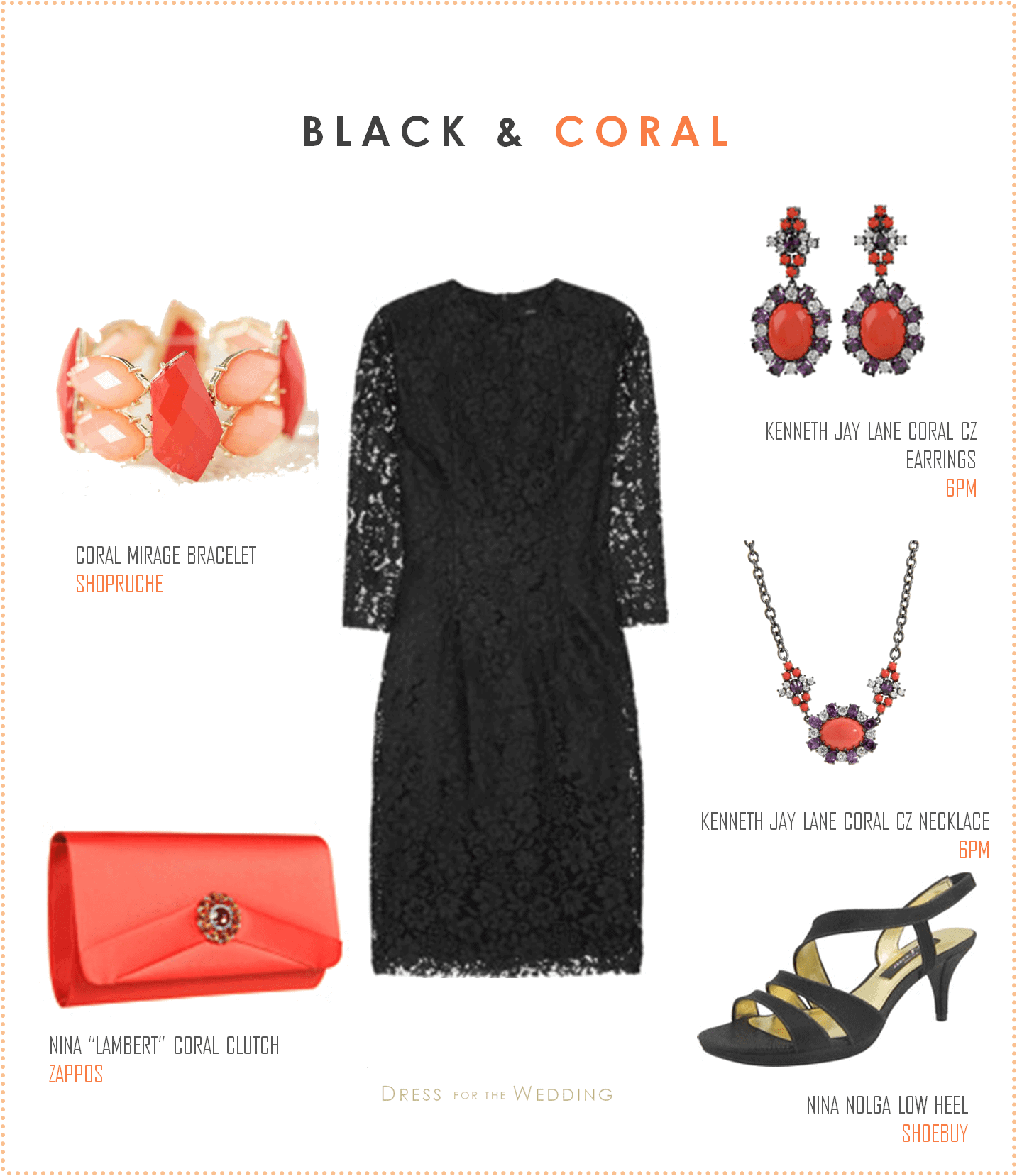 Lace Black Dress / Kenneth Jay Lane Coral Earrings /Kenneth Jay Lane Coral Necklace / Low Heel Black Sandals / Coral Clutch / Coral Bracelet