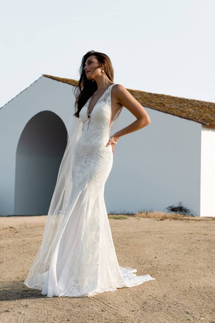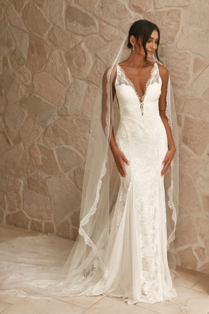 Chelo, is a gorgeous all-over fitted lace gown with hand-placed lace panels, a deep neckline, and a keyhole back.