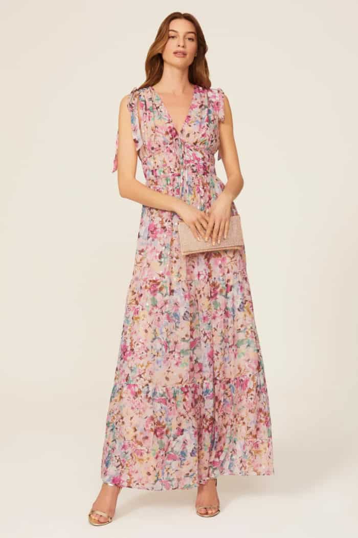 This watercolor printed pastel maxi dress has beautiful ruching and style that will look just right at any outdoor or coastal weddings this season.